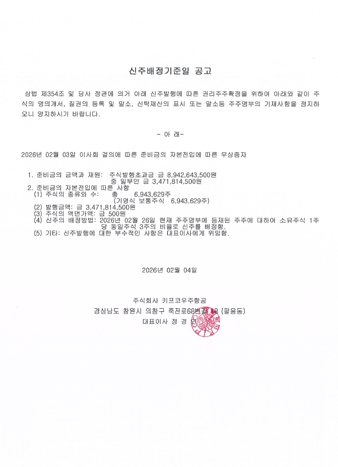 키프코우주항공_신주배정기준일 공고